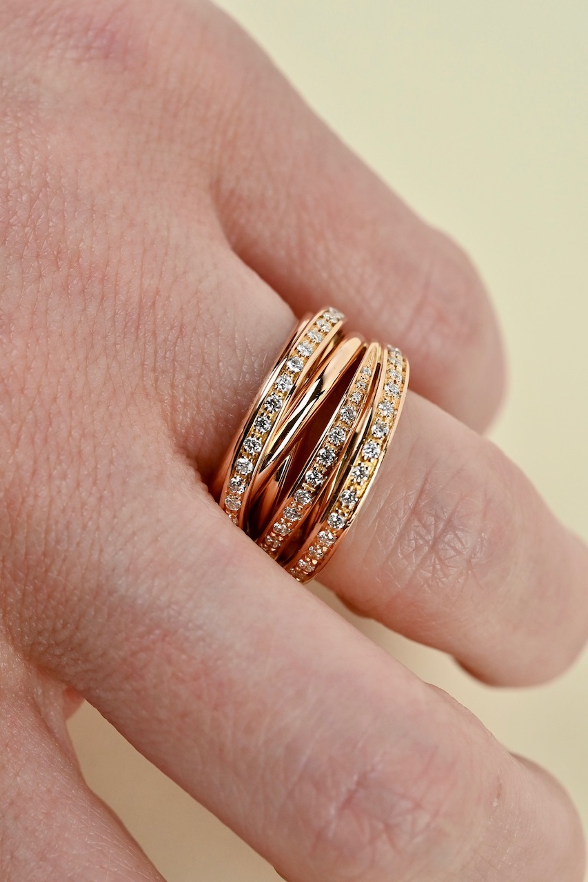 La bague Ambridge est fabriquée en or rose 18 carats et sertie de diamants. Ambridge est une bague de seconde-main, entièrement révisée par nos soins et remise à neuf.